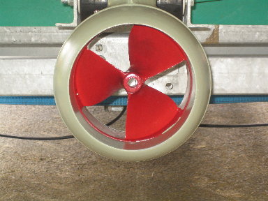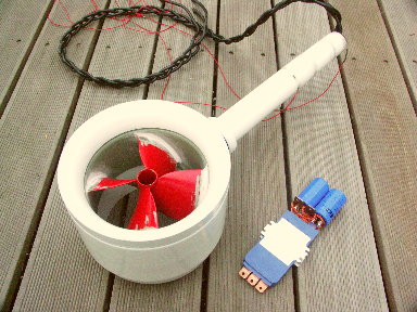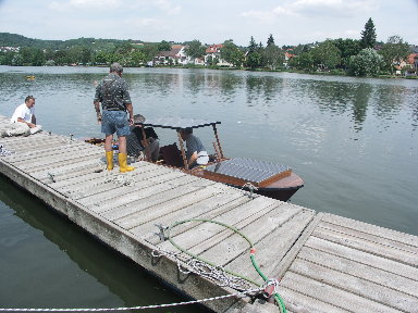 Mit spürbar mehr Schub aber ohne das geringste Geräusch vom Antrieb pflügte das Boot schon wenig später den Main auf und ab. Am Steuer war Torsten Wernecke und ich war im "Maschinenraum" verzweifelt bemüht auf dem durch eine Schwimmweste notdürftig abgeschatteten Notebook irgend etwas zu erkennen und gleichzeitig den auf Deck stehenden, nichtvergossenen SLS vor Spritzwasser zu schützen. Den Schub steuerte ich auf den ersten Fahrten noch per Computer, um die letzten Feinabstimmungen vorzunehmen. Es hat dann auch alles funktioniert (jedenfalls mußte ich nicht "straf"-rudern, wie beim ersten Treffen!) und so konnte Torsten zum Abschluß noch eine kleine Runde mit seiner Familie auf dem Main drehen - jetzt jedoch völlig autark fahrend per eingebautem Schubhebel, der mit unserem Servotesters (ST) realisiert wurde. Fazit dieses Tages: Die geänderte Schraube arbeitet erheblich besser als die ursprünglich eingesetzte - aber immer noch nicht optimal! Wir konnten jetzt 8KW (2KW mehr als beim ersten Versuch) umsetzen, jedoch erreichten wir nur 160Aac im Motor, da der Motor hier schon an seine Drehzahlgrenze stieß. Die Schraube müßte also wieder geringfügig mehr Steigung bekommen um die vollen 200Aac auszuschöpfen. Der Motor hatte ja schon beim ersten Versuch gezeigt, daß ihm 200Aac absolut nichts ausmachen. Mit der optimalen Schraube sind wohl mehr als 10KW möglich - wir werden sehen ... |