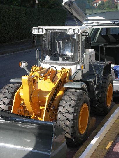Nachdem wir uns an den Anblick des Modell gewöhnt hatten und unsere eigene Sprachlosigkeit überwunden hatten, haben wir uns auch gleich an die Arbeit gemacht, den Motor (Torcman Monster TM685-40) zu vermessen und den SLS-42-110 darauf anzupassen. Keine 2 Stunden später setzte sich der Radlader in Bewegung, um vom Anhänger über die Rampe auf die Straße hinab zu fahren. Die Hoffnung bestand, ihn auch wieder hinauf zu bekommen ;-)