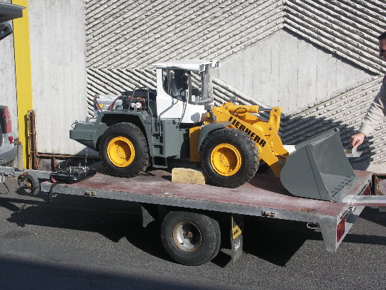 Ersten Tests in der Ebene (mit einem sichtlich erleichterten Modellbauer als Testpilot) folgten Tests im Gelände und am Randstein der Straße. Dank der von Gerhard vorgesehenen Fliehkraftkupplung und der Momentenregelung des SLS funktionierte auch alles recht schnell. Schnell wurde klar, daß die fehlende Momentenregelung der ´anderen´ (abgerauchten) Reglern die Ursache für ihr plötzliches Ableben war: sobald die Kupplung geschlossen hatte, stieg der Motorstrom bzw. das Drehmoment über alle Grenzen - ohne Möglichkeit den Motorstrom zu begrenzen, bedeutet dies das schnelle (und sichere) Ende des Reglers ... Unser SLS-42-110 (wir benötigten lediglich unseren kleinsten SLS!) hat diese Probleme zum Glück nicht :-) Es war sogar möglich den (400kg!) Radlader mit schleifender Kupplung am Berg bzw. am Randstein zum Stehen zu bekommen! ... und den Radlader am späten Nachmittag für die Heimfahrt wieder zurück auf den Hänger zu bekommen war das geringste Problem. Am Samstag (06.10.2007) konnten wir Gerhard Süß ein weiteres Mal bei uns begrüßen. Er hat seit unserem letzten Treffen das Getriebe des Radladers überarbeitet, damit noch mehr Drehmoment zur Verfügung steht. Überschlägig gerechnet sollten jetzt mehr als 500Nm an den Räderen anstehen! Jetzt wird die Schaufel auch wirklich voll... Bei intensiver Arbeit im Gelände (wie in den beiden Videos zu sehen) reichte eine Akkuladung für mehr als ein Stunde. Als echter Stromfresser hat sich dabei die Hydraulik herausgestellt (hier werden noch ungeregelte Bürstenmotoren eingesetzt) - es besteht also noch Optimierungspotential! Im reinen Fahrbetrieb in der Ebene sollte eine Akkuladung für 3 (evtl. auch 4) Stunden reichen. ... mehr Videos: Mehr Details zu diesem tollen Modell: hier klicken Weitere Modelle von Gerhard Süß gibt es unter www.rc-grossmodellbau.de zu sehen! |