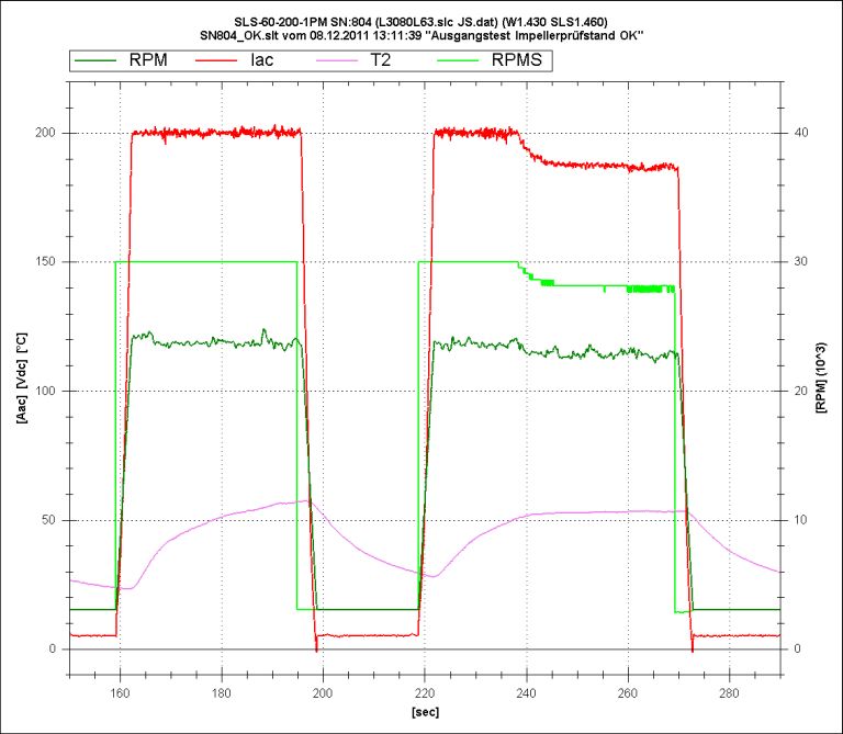 Obiges Bild zeigt einen typischen SLS-Ausgangstest am Impellerprüfstand. Dabei wird ein SLS-60-200-1PM bis an seine Stromgrenze (200Aac) betrieben und die Temperaturabregelung auf korrekte Funktion getestet: - Im ersten Teil (160..200sec.) ist die Temperatur-Abregelschwelle auf 70°C eingestellt und wird nicht erreicht. - Im 2. Teil der Aufzeichnung (220..270sec) steht die Temperaturschwelle dagegen auf 50°C. Sobald die Schwelle von 50°C überschritten wird, reduziert der SLS selbstständig den Strom. Dadurch pendelt sich die Temperatur bei ca. 53°C ein und der Regler gibt noch 185Aac an den Motor ab ohne daß sich die Temperatur des SLS weiter erhöht. Der SLS-60-200-1PM wurde bei diesem Versuch auf einem kleinen Kühlkörper befestigt, der im Luftstrom angebracht war. |